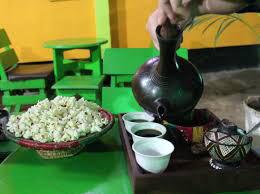 The favourite drink of many Ethiopians is bunna (coffee). Bunna is drunk in Ethiopia in a unique and traditional way known as a “coffee ceremony”. First the coffee is roasted, then ground and placed in a Jebena (coffee pot) with boiling water. When ready it is then served to people in little cups, up to three times per ceremony.
