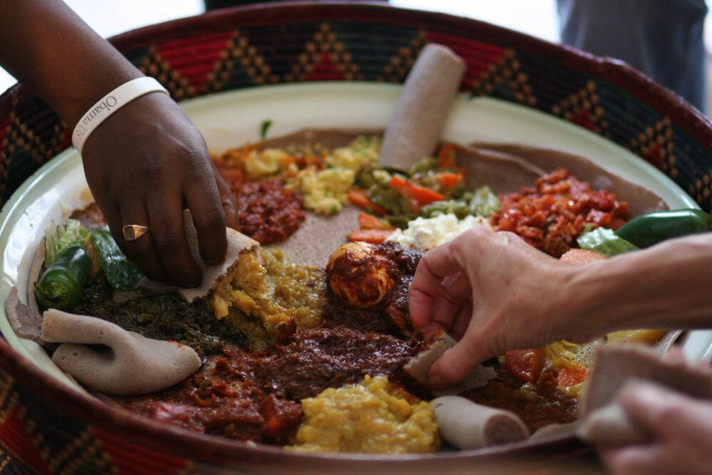 Ethiopia’s staple grain is called teff, and from its flour the Ethiopians fashion a large pancake-like bread called injera that they place directly on the dining table. Other dishes that make up the meal are portioned onto the injera and diners eat by scooping these portions into rolled-up pieces of the injera that they have torn off